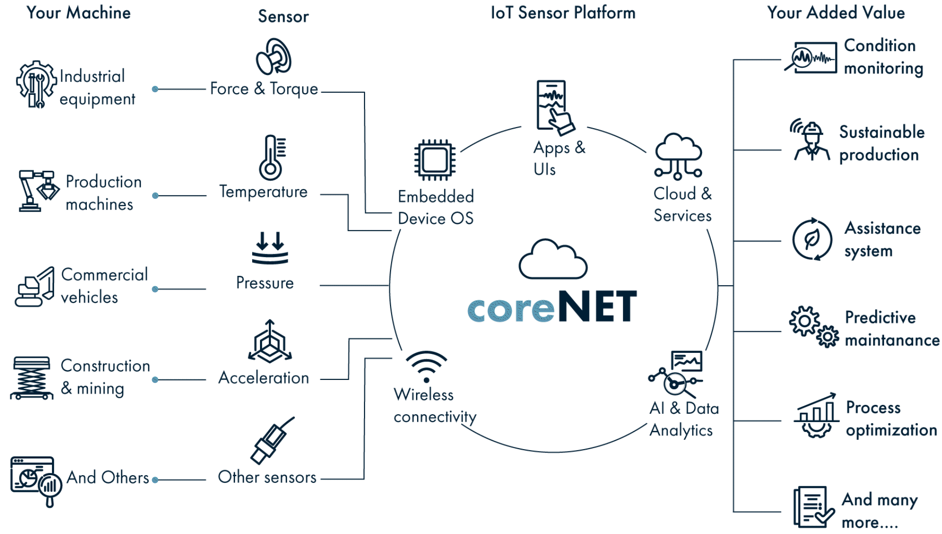 Die coreNET IoT Sensorplattform bietet vielseitige Lösungen, um Ihre Industrie 4.0-Ambitionen mit fortschrittlichen Technologien zu verwirklichen und einen nachhaltigen, effizienten sowie sicheren Betrieb zu gewährleisten. Hier sind sechs Schlüsselbereiche, in denen unsere Plattform einen signifikanten Mehrwert für Ihr Unternehmen bieten kann:
